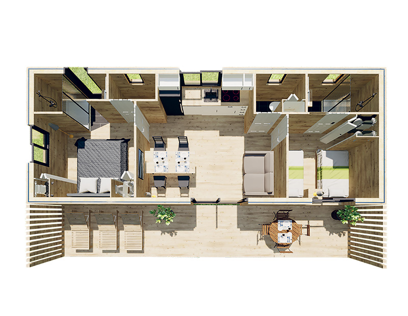 Ses 2 chambres indépendantes avec sanitaires sont déployées autour d’un confortable espace de vie qui s’ouvre par une grande baie vitrée sur son incroyable terrasse de 20 m², pouvant aisément accueillir un salon de jardin.