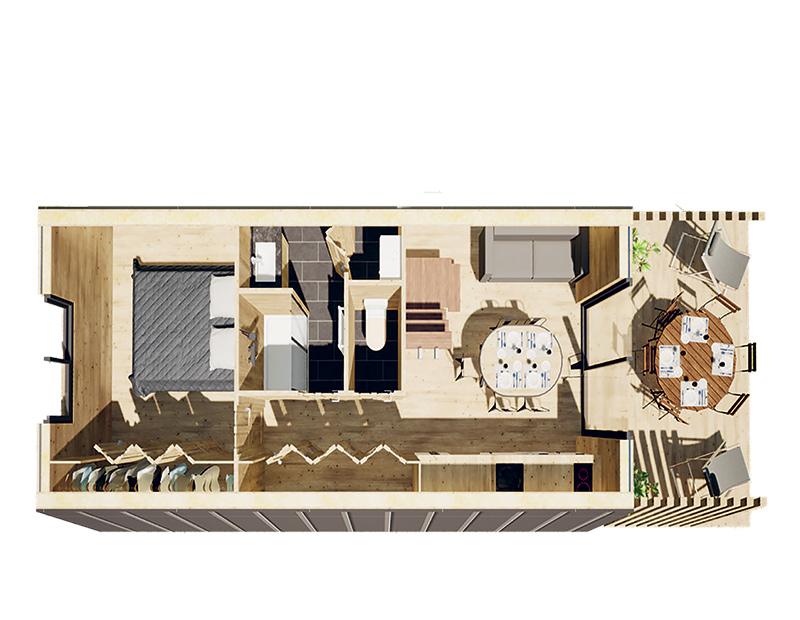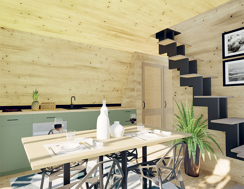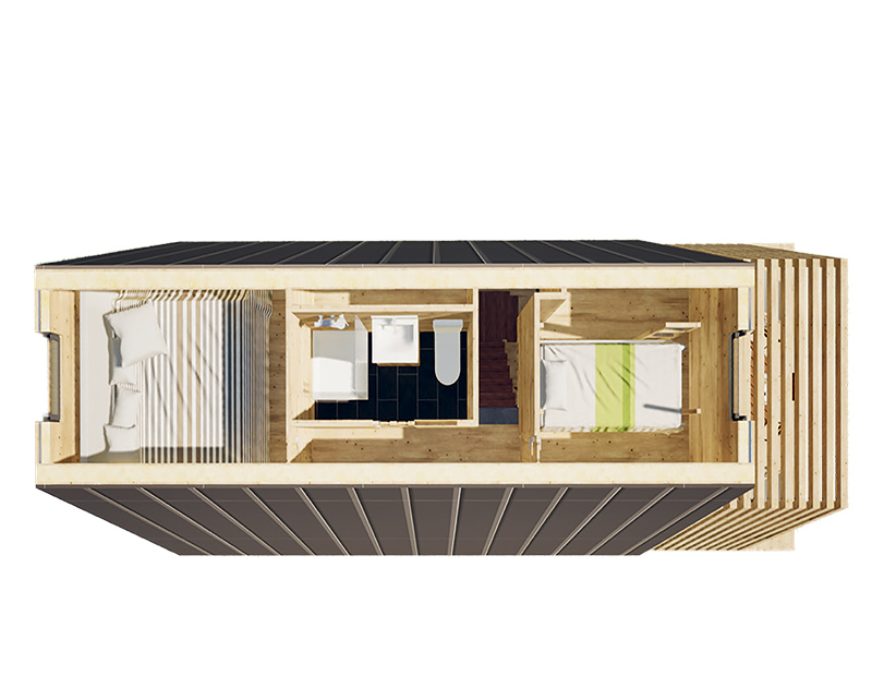 Son architecture permet de définir 2 vrais espaces d’intimité : un rez-de-chaussée complet de 38 m² avec chambre, sanitaires et cuisine ouverte et un étage de 18,7m² avec 2 chambres et sanitaires, pour les enfants ou les amis.