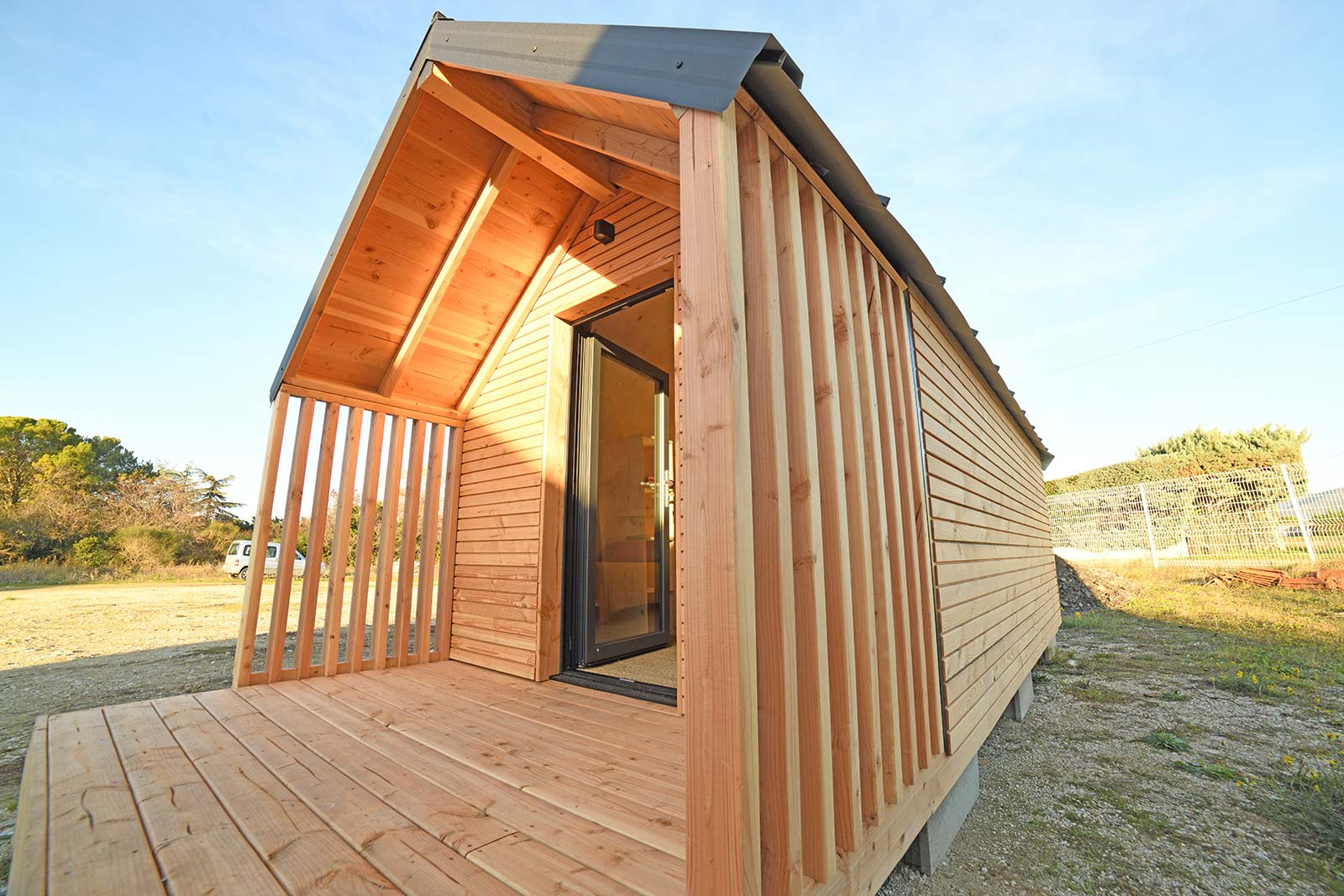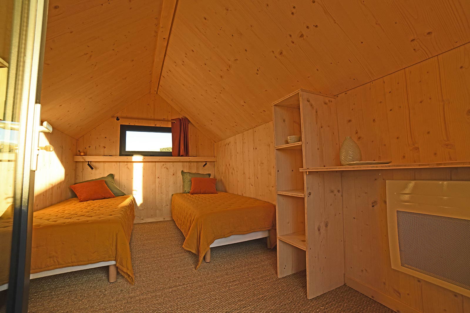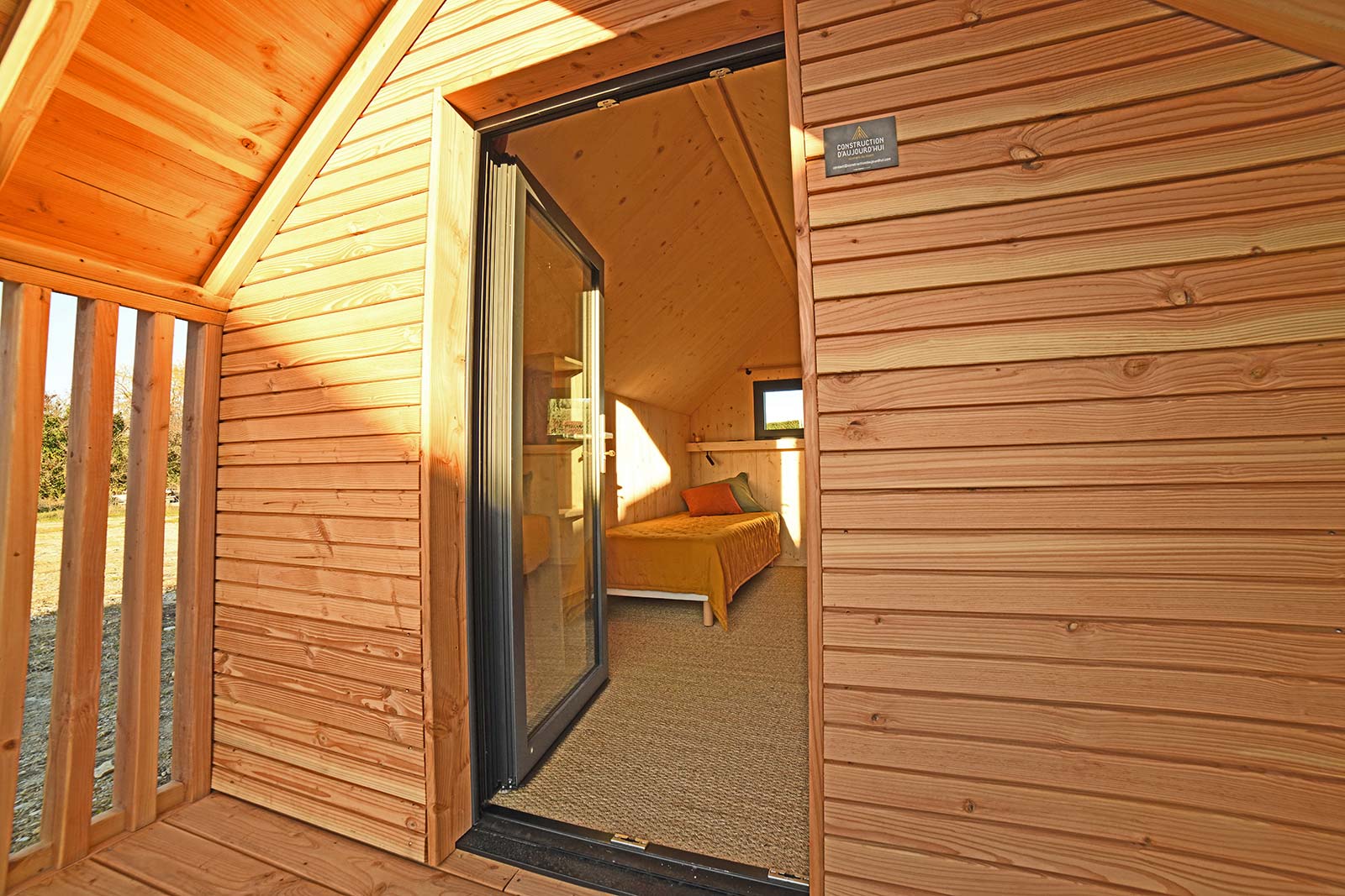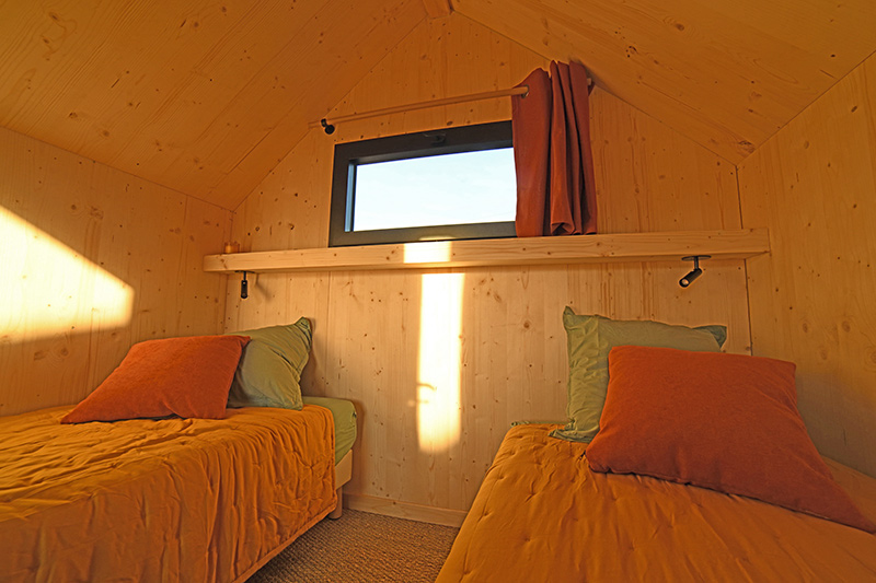 Avec son couchage pour 2 personnes et sa petite terrasse couverte, elle devient l’abri intime, serein, confortable et ressourçant, la cabane de notre enfance.